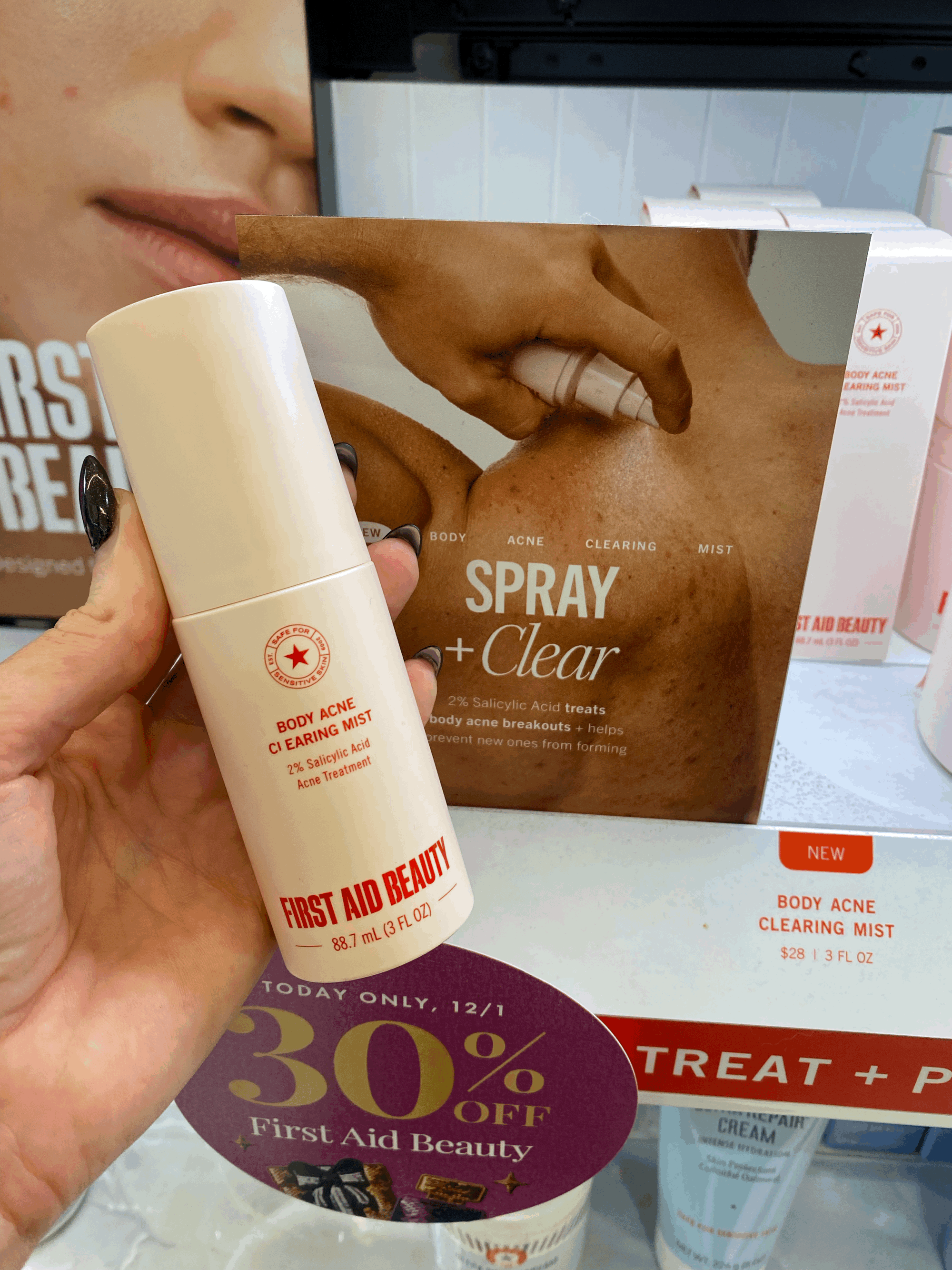 First Aid Beauty Body Acne Spray and Soft Services Buffing Bar.
