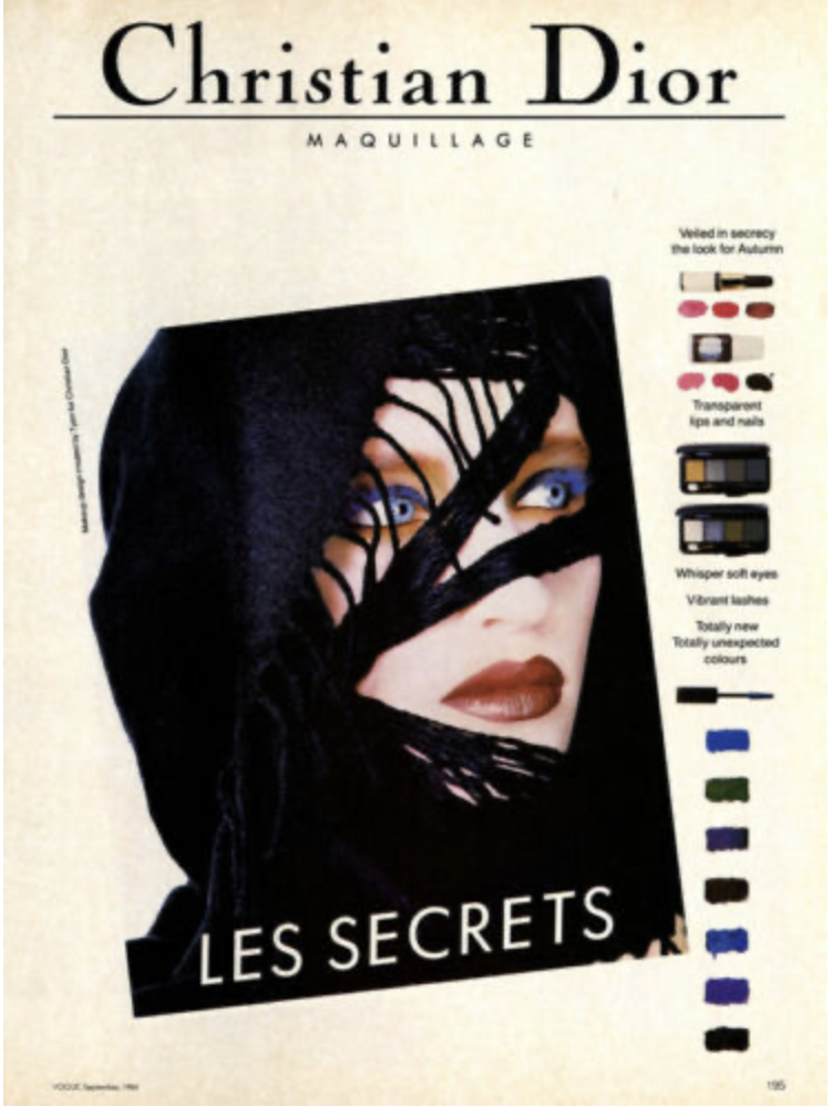 Back to the cosmetics. In 1984 Dior presented experimental color from the hands of Tyen, the new Creative Director at Dior. Using bold colors and blue mascara felt shocking at the time. True to Dior's value of revolutionizing femininity, I think the use of color in the 1980's was appropriate and empowering to the children born of earth toned woman in the 1960's. When thinking of Dior you may mostly imagine classic sophisticated colors like black, cream, and champagne. When actually looking at past and current ad campaigns we are seeing colorful creative inspiration of bold in makeup.