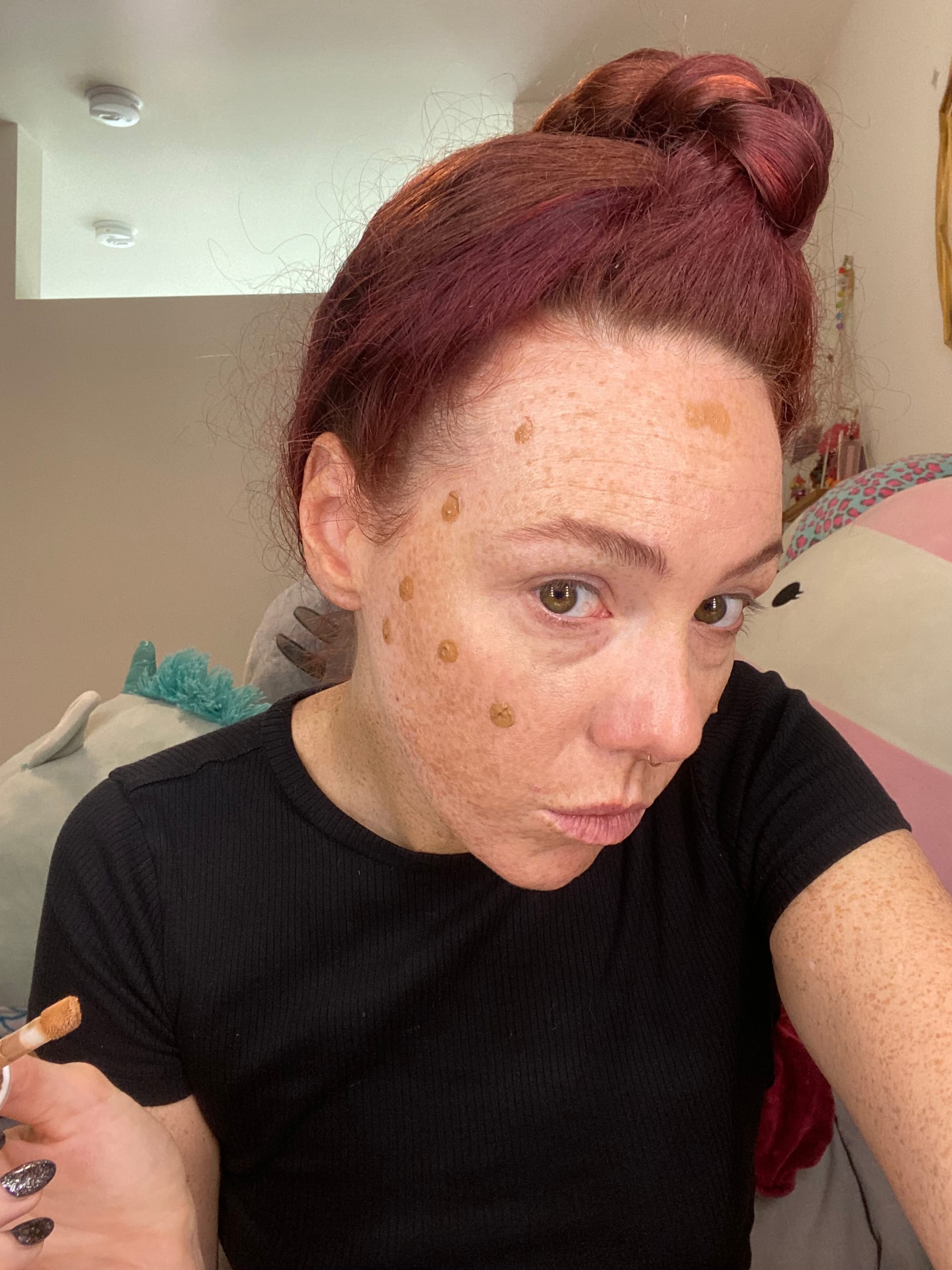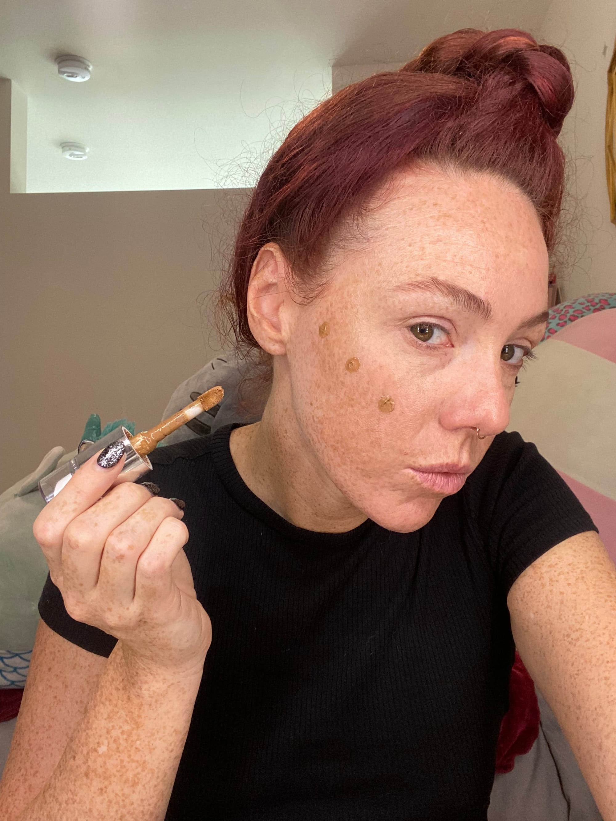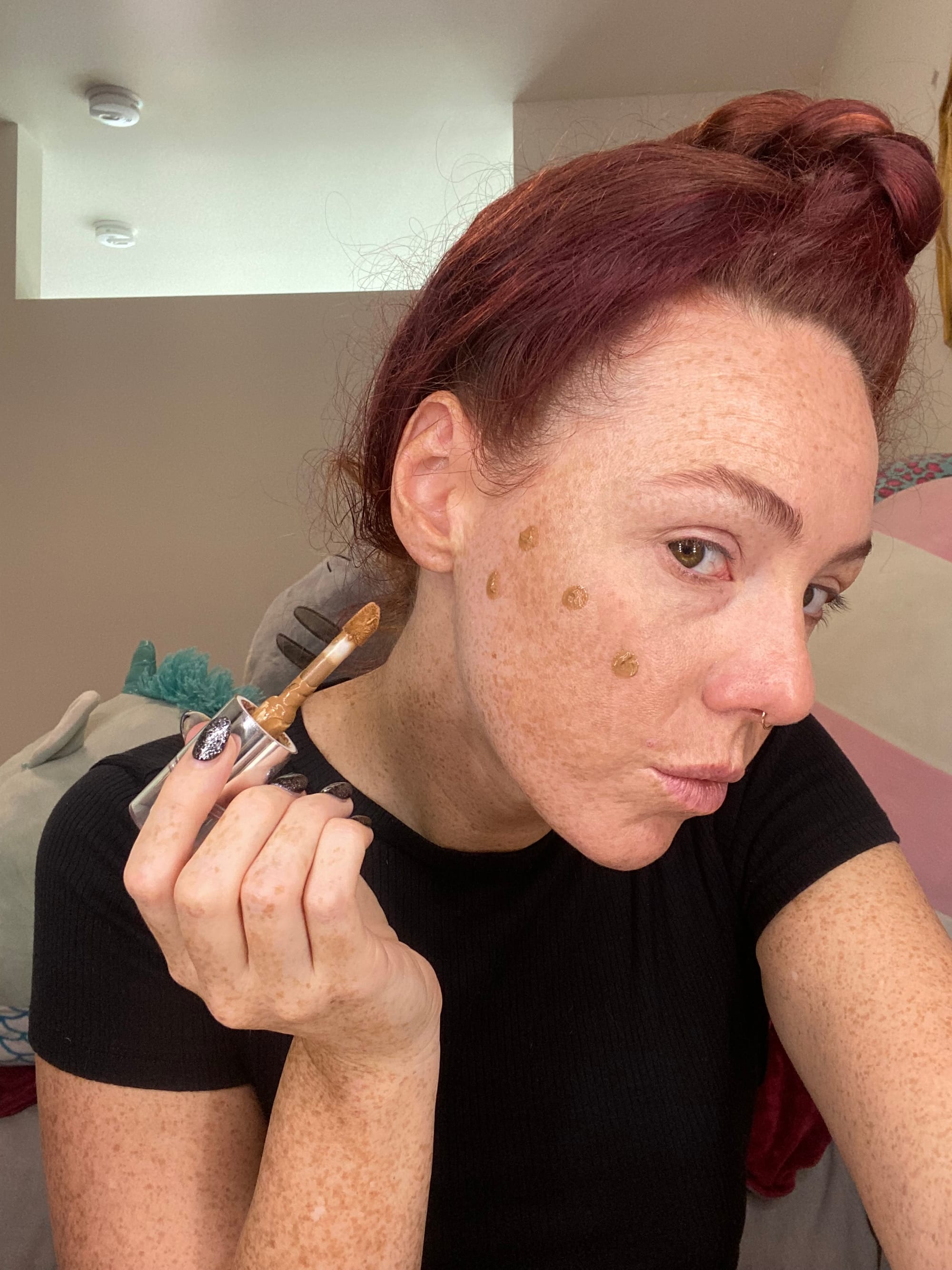 Using the doe foot applicator place three dots starting just under the apple of your cheek in an ascending diagonal line just below the cheek bone. Dip back into the bottle for each side of the face. Dip back in for product and add a fourth dot near where your jaw hinges under the previous three dots.