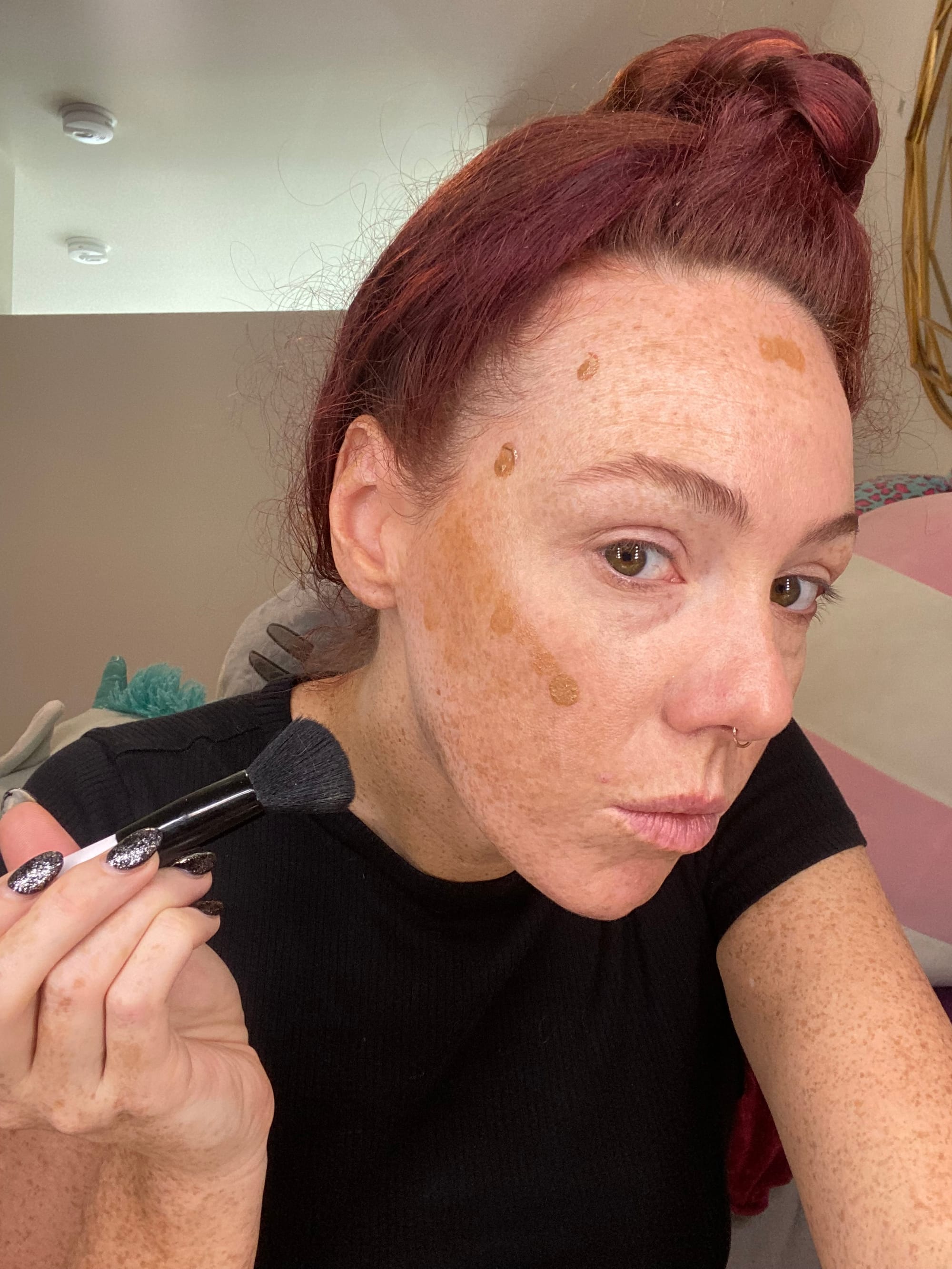 To blend do not swipe, pat and push the bronzer into the skin. Use a stippling motion repeatedly patting product into the face. Pat directly on top of the earlier dots and on either side of the dots For an even blend.