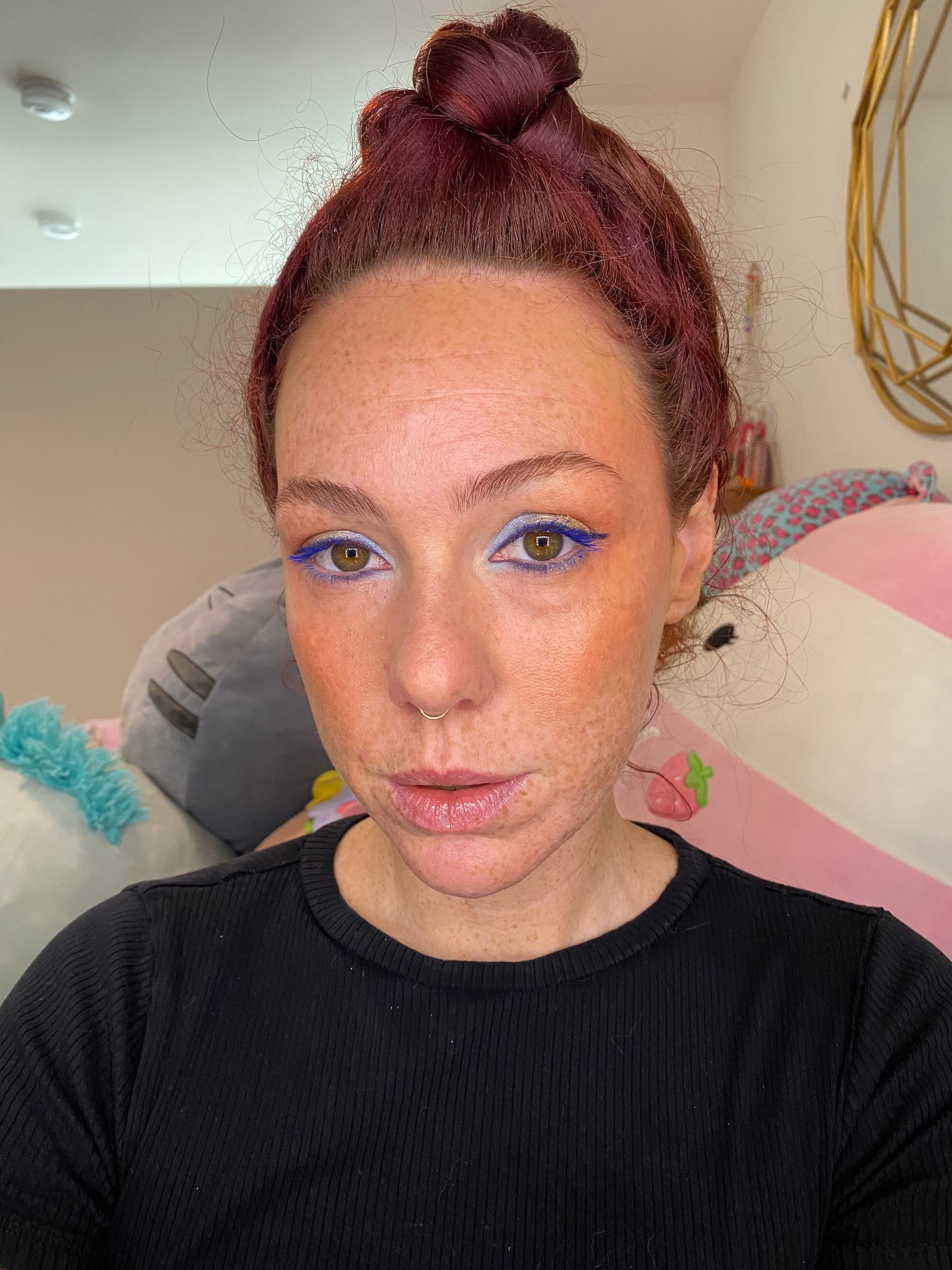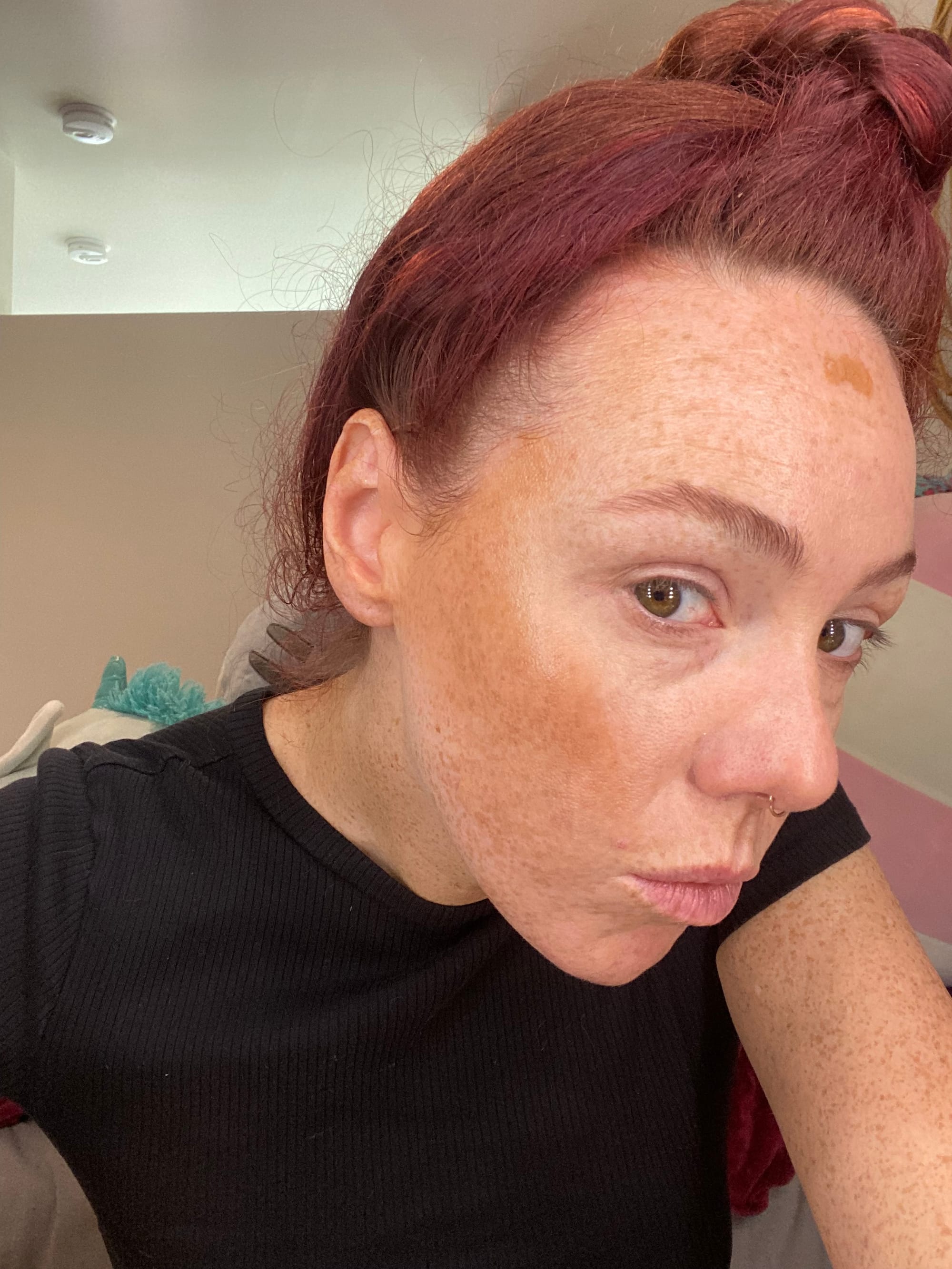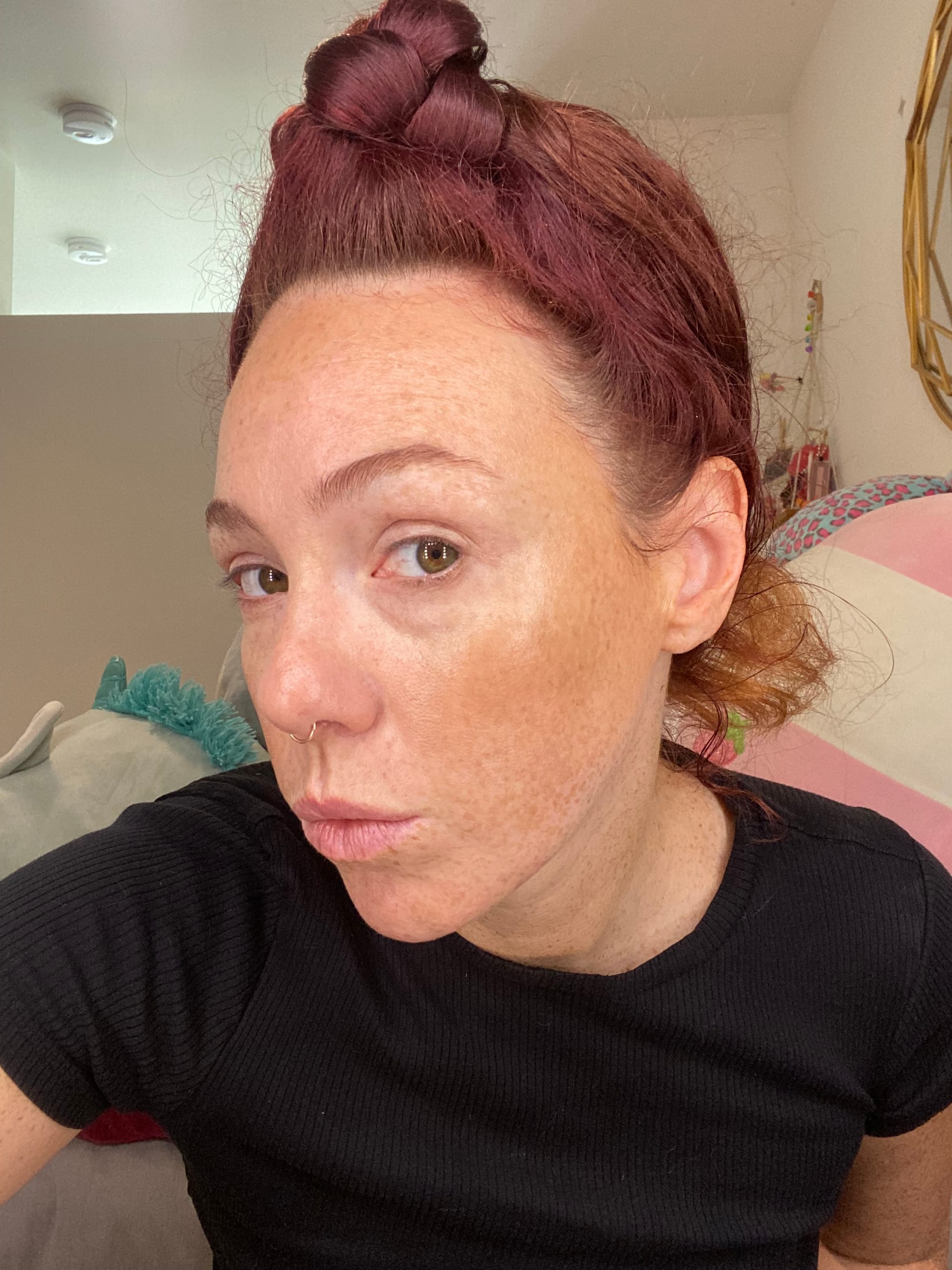 Bare face, after bronzer, full look.