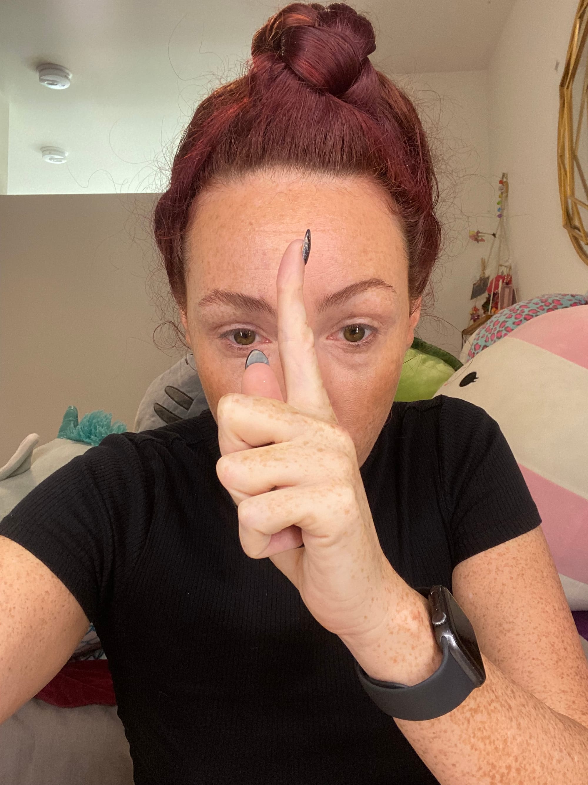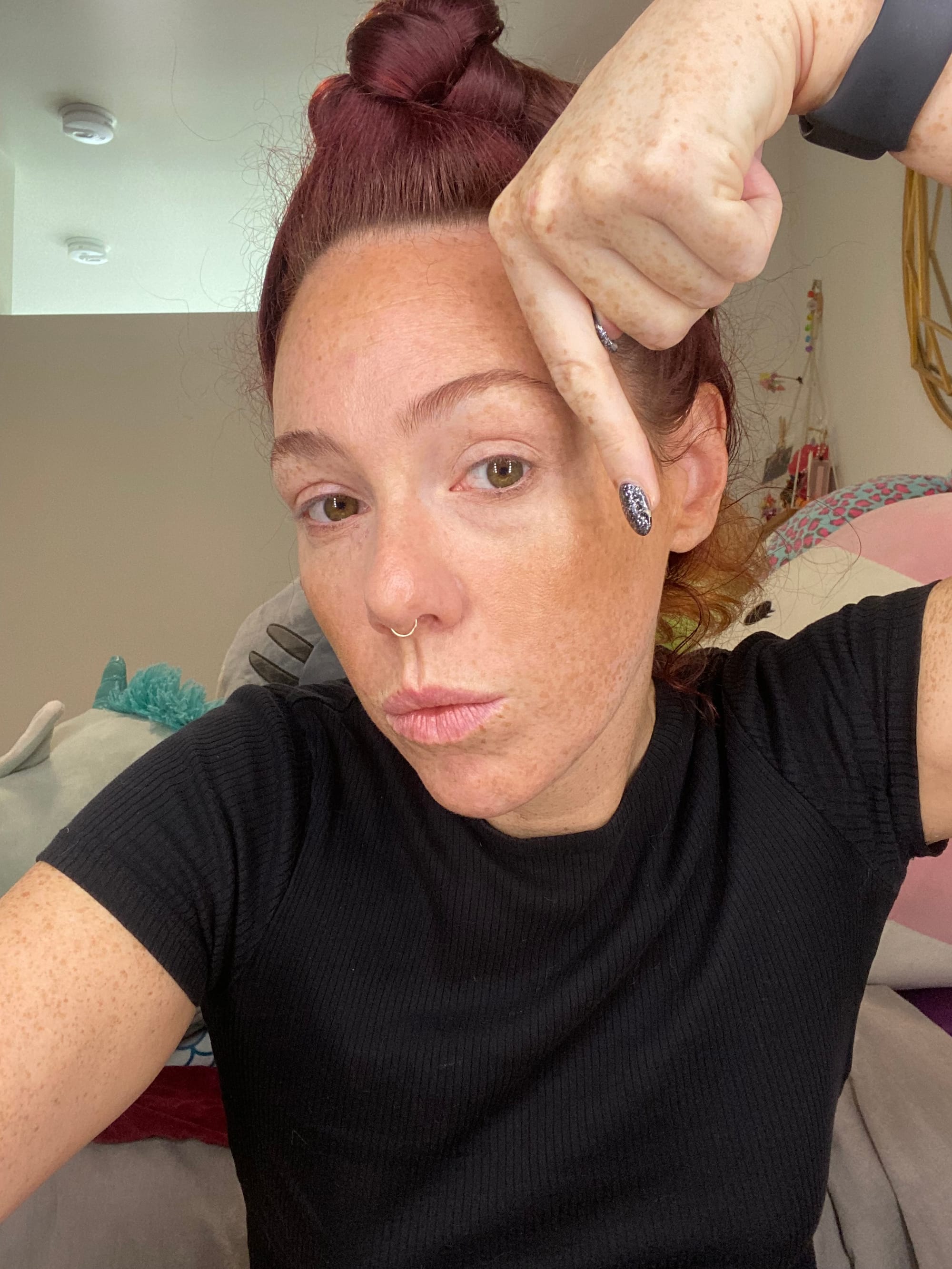 Dip back in for product and place dots at your temple and five dots 1/2 inch away from your hairline. Dip back into the bottle for more product as needed for the forehead area.