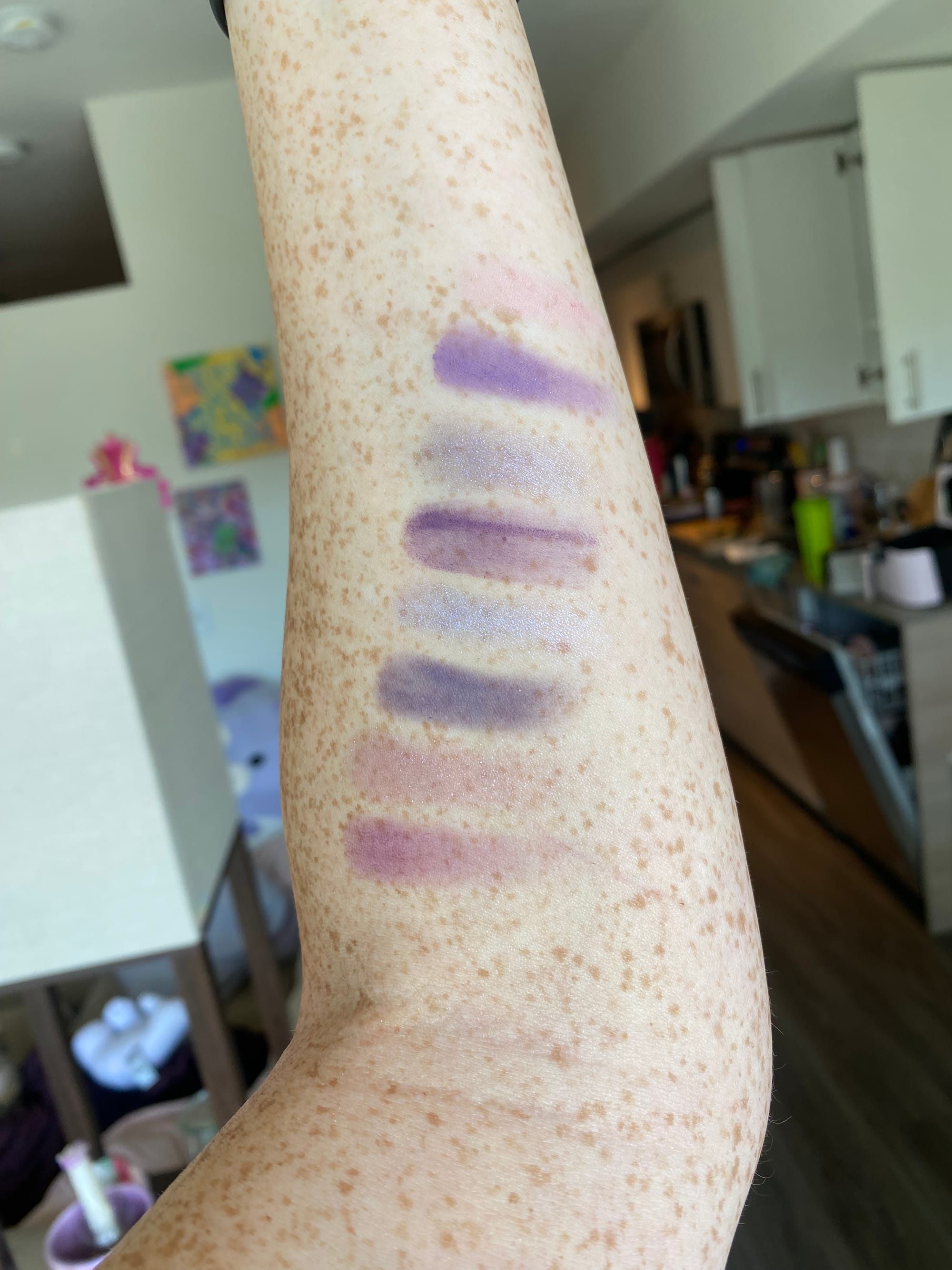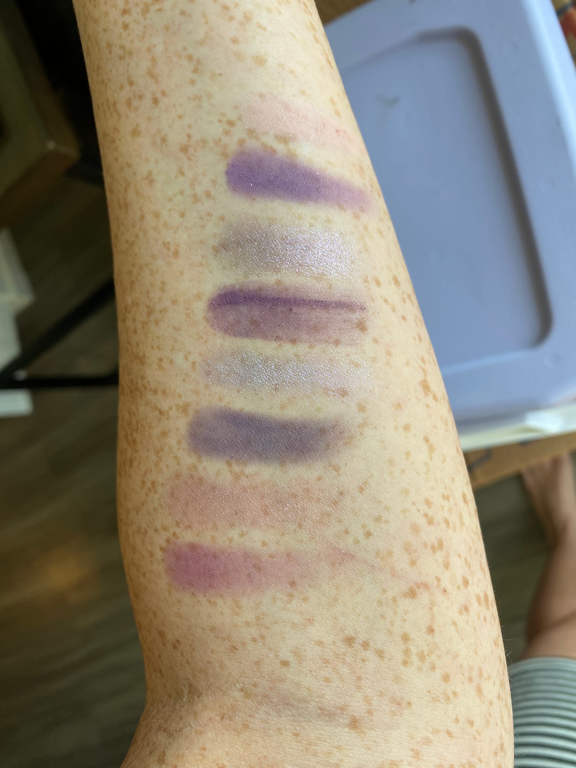 First impressions swatched with a finger with no base or primer are that the colors are vibrant, medium pigment, and generally finely milled, meeting a “high” standard of quality. Purples are notoriously difficult to formulate and even on first impressions I found that to be true of this palette. These are dry. Much dryer than modern eyeshadow formulas. You will not get a satisfying creamy touch from this palette.